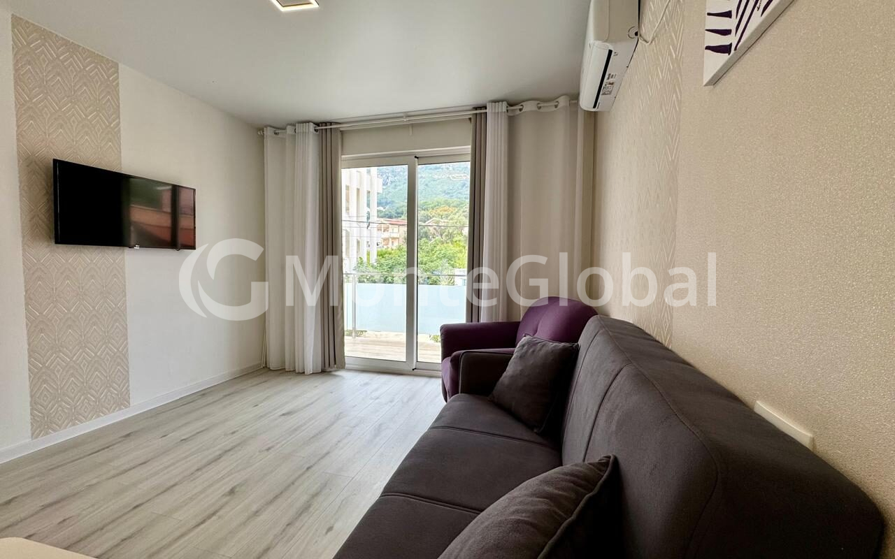 В гостиной для комфорта установлен кондиционер. Из окон спальни можно любоваться видами на море и горы.