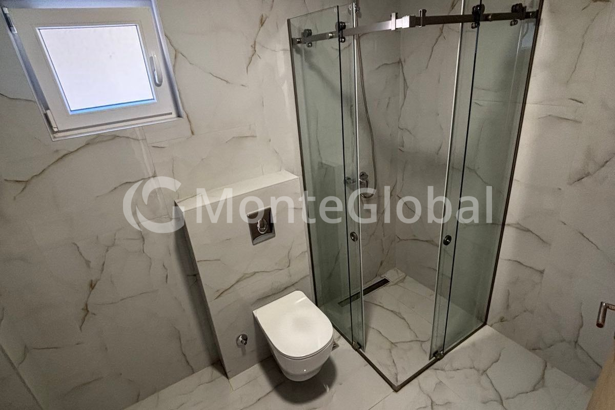 Объект расположен на высоком цокольном этаже (фактически первый этаж) и имеет общую площадь 58 м², дополненную террасой, что в сумме составляет 65 м². Планировка включает гостиную, кухню, одну спальню и санузел. Все необходимые документы оформлены, здание введено в эксплуатацию.
