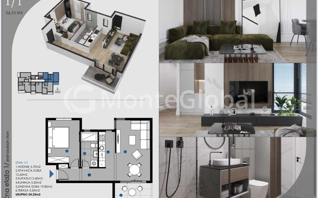 Планировка включает в себя гостиную, объединенную с кухней, спальню, санузел и террасу, с которой открывается вид на море и горы.